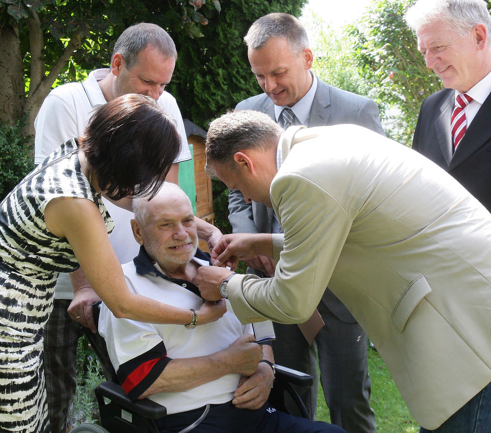 Auf Antrag der SPD-Fraktion beschloss der Gemeinderat im Juli 2014 einstimmig, dem ehemaligen Sportreferenten und langjährigen SPD-Gemeinderat Walter Zill die Goldene Bürgermedaille zu verleihen. Und gleich alle drei Bürgermeister kamen zu dieser Verleihung in den Garten der Familie Zill: Franz Heilmeier, Hans Mayer und Thomas Seidenberger. Im Hintergrund Sohn Günther Zill, die SPD-Vorsitzende Beate Frommhold-Buhl assistierte beim Anstecken der Ehrennadel.