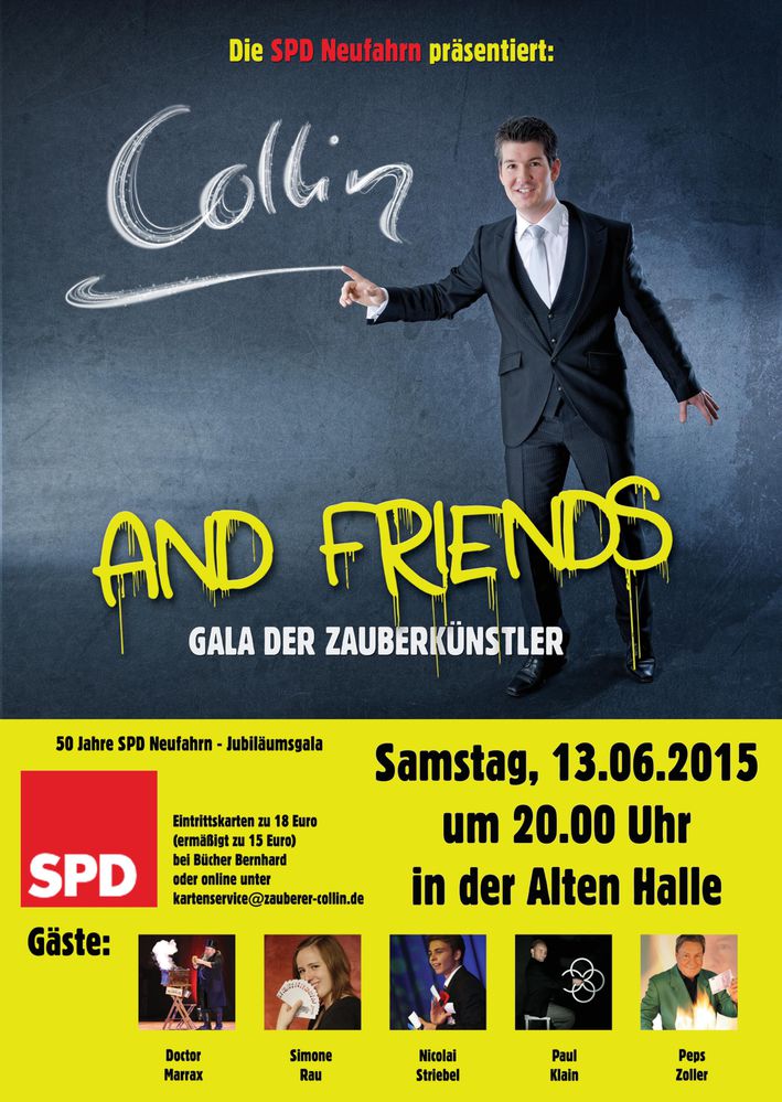 50 Jahre SPD Neufahrn, das ist ein Anlass, um sich etwas Besonderes einfallen zu lassen: Sechs Zauberer kommen aus ganz Deutschland nach Neufahrn und bieten den Gästen eine Gala, wie es sie hier noch nicht gegeben hat. Von Mentalmagie über Taschenspielertricks wird eine Vielfalt an Zaubertricks geboten, und jeder der Zauberer hat seine ganz persönliche Art und Weise, um die Zuschauer in seinen Bann zu ziehen.