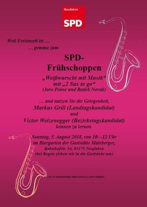 Schön war’s wieder und gut besucht beim Frühschoppen der SPD Neufahrn „Weißwurscht mit Musik“ im Biergarten vom Gasthaus Maisberger. Natürlich waren auch unsere Kandidaten Markus Grill (Landtag) und Victor Weizenegger (Bezirkstag) mit dabei. Für die Musik sorgten Jaro und Radek als „2 Sax to go“.
