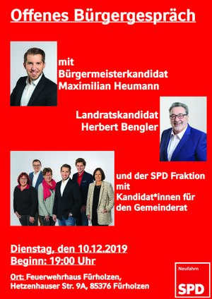 Die SPD Neufahrn lädt zu einem offenen Bürgergespräch ins Fürholzer Feuerwehrhaus ein. Dort stellen sich der Bürgermeisterkandidat Maximilian Heumann, der Landratskandidat Herbert Bengler und weitere SPD-Gemeinderatskandidat*innen vor.