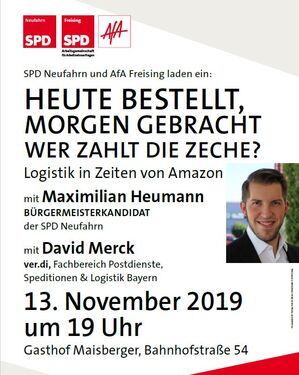 Am Mittwoch, den 13. November, 19 Uhr, lädt die SPD Neufahrn ins Gasthaus Maisberger. Der Referent David Merck ist ein Kenner der Zustellbranche, speziell auch von Amazon.