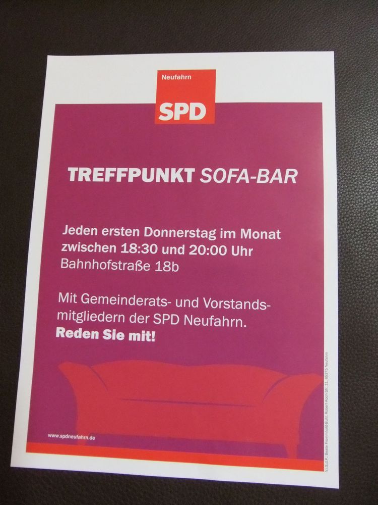 Ab Donnerstag, 3. Juli, ist es wieder soweit: Mitglieder von Fraktion und Vorstand der SPD Neufahrn treffen sich nun wieder regelmäßig jeden ersten Donnerstag im Monat in der Sofa-Bar, Bahnhofstraße 18b. Wir freuen uns über interessierte Bürgerinnen und Bürger, die mit uns über Neufahrner Themen oder besondere Anliegen diskutieren wollen oder einfach nur Fragen haben. Kommen Sie vorbei, reden Sie mit! Ab 18.30 bis circa 20 Uhr.