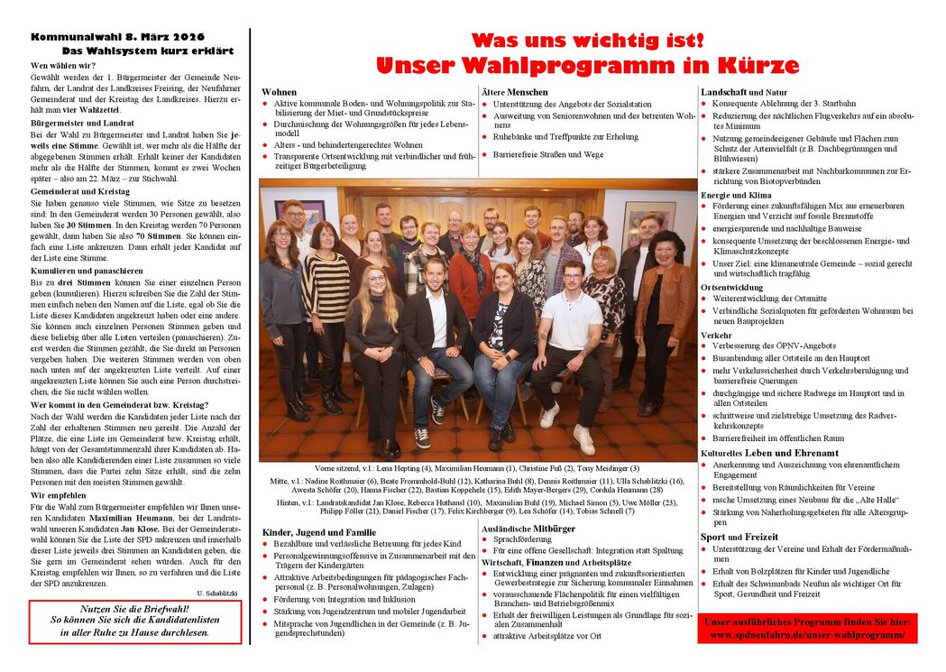 Diese Schwerpunkte spiegeln sich im offiziellen Wahlprogramm der SPD Neufahrn zur Kommunalwahl 2026 wider. Die Kurzfassung finden Sie hier, die ausführliche Version unseres Wahlprogramms können Sie hier lesen: Wahlprogramm 2026 (6 Seiten)